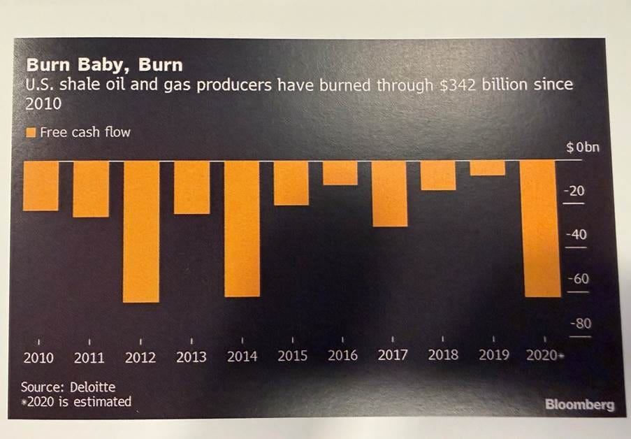 And of course there was a huge ramp in competition – Cole’s slide had 64 oil company logos. And again leverage was a feature, because of the sheer size of the spend, especially relative to the size of some of the players. Here is the cash burn: