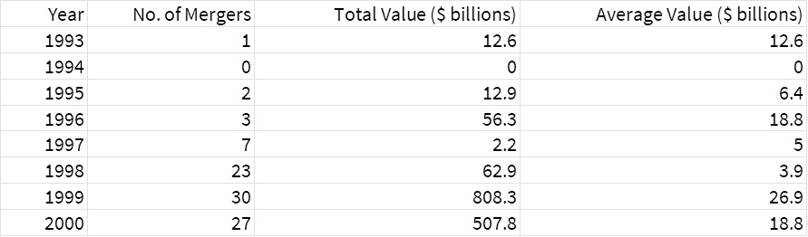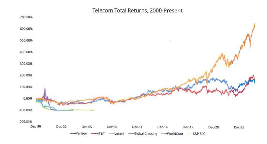 In 1996, the telecom sector was deregulated and there was plenty of investor excitement with the sector taking off, although cellular connections only really accelerated after the bubble burst. But telcos raised $1.6tn of equity and $0.6tn of debt in the 1990s. That may not sound much today but remember there wasn’t a single trillion dollar company then and in real terms the numbers are much higher.