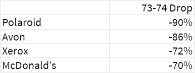 That 1973-74 selloff highlighted in the table above took just 18 months and the average of the Nifty Fifty fell 60%. It took on average 10 years for the group to recover their nominal price highs. Given the inflation in that decade, this was still a disastrous result in real terms.