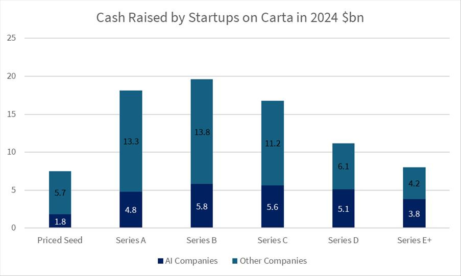 Cole pointed to studies showing that AI hadn’t had a real effect on productivity as yet, although there is a lot of investor excitement and a huge amount of fund raising. Here is AI as a proportion of VC investment in the US: