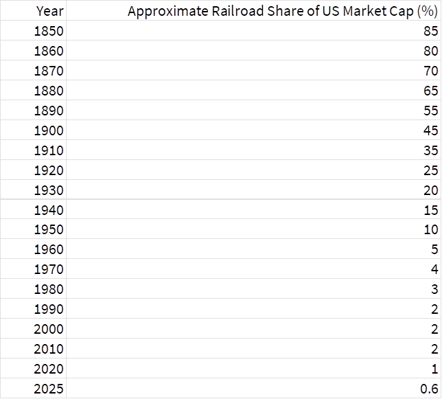 Rail infrastructure capex was an astonishing 6% of GDP in the 1880s. He put up the names of the current railroads and their bankrupt predecessors on several slides. There were a lot of railroad companies competing, another bubble characteristic.