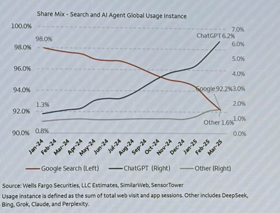 He then turned to the current cycle and pointed out that Google’s search monopoly, once thought invincible, had seen its market share slide from 98% to 92%: