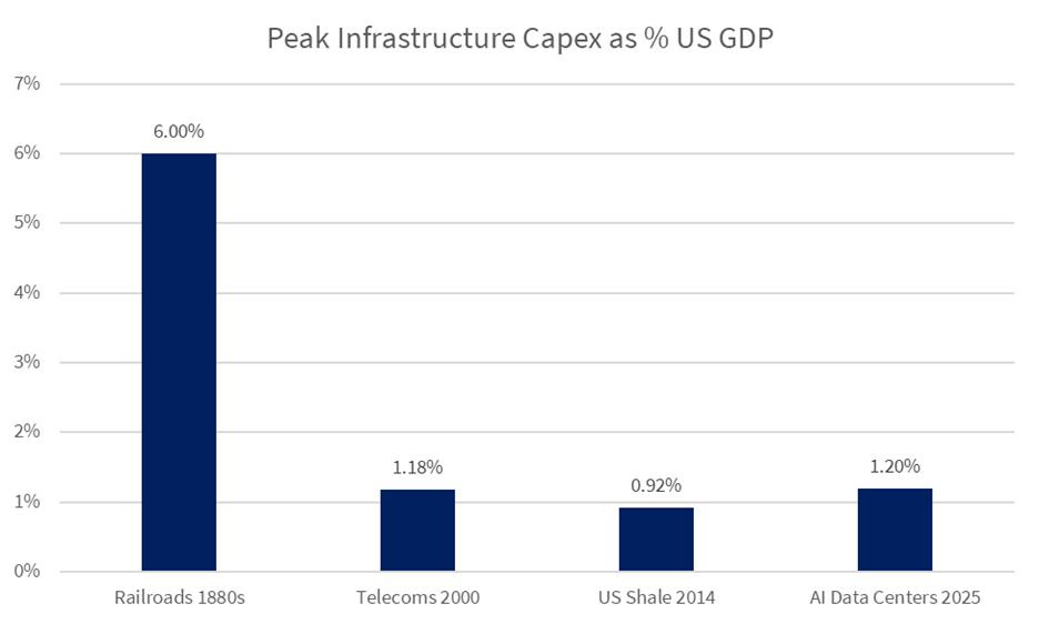 That’s what makes the current cycle so interesting. Cole Smead explained that they see AI as just another American Capex Cycle mania, likening this to the 1880s railway mania and crash, the dot.com telecoms bubble and the 2010 shale “drill baby drill” mania. What makes this interesting is not the conclusion, but the framework.