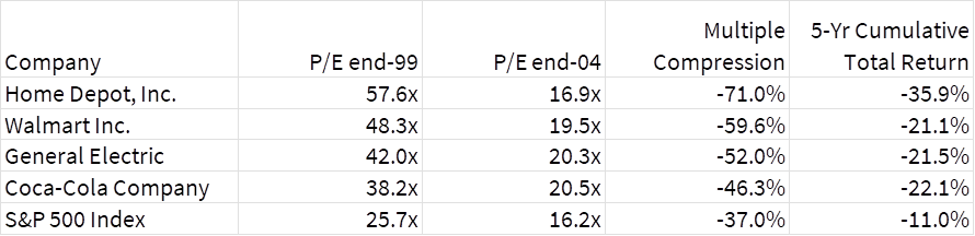 Jonathan then turned to the inflation of so-called quality stocks in the dot.com era. Here is a selection of stocks then and their subsequent 5-year return: